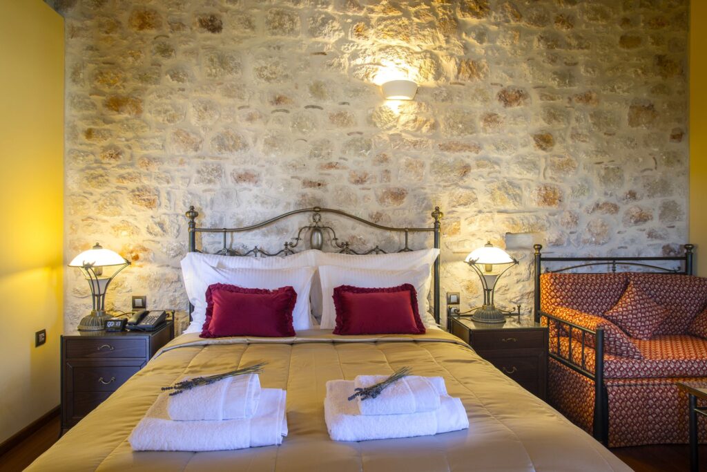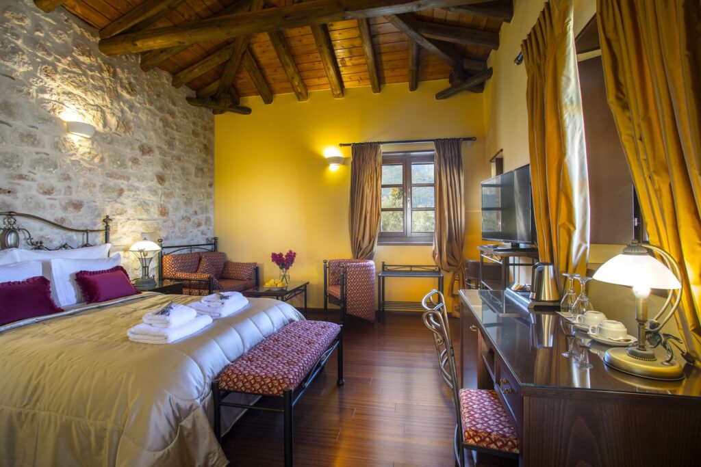 The Standard Double Room promises a stay experience that will wrap guests in a veil of stylish comfort. Defined by luxuriously rustic aesthetics, a balanced colour palette will create a soothing sensation for you to relax in. Featuring a double-sized bed, a sofa bed, the Standard Double Room can accommodate up to 2 adults plus 1 child. The interiors are completed by a reading chair and desk, while the bathroom is exceptionally lavish, with an option between a bathtub or glass pane shower with rainfall shower head. A personal patio or balcony is there for spending some tranquil, outdoor moments, overlooking the verdant gardens, the resort’s sapphire pool, while your backdrop can be the mountaintops or the landmarks of Mystras.