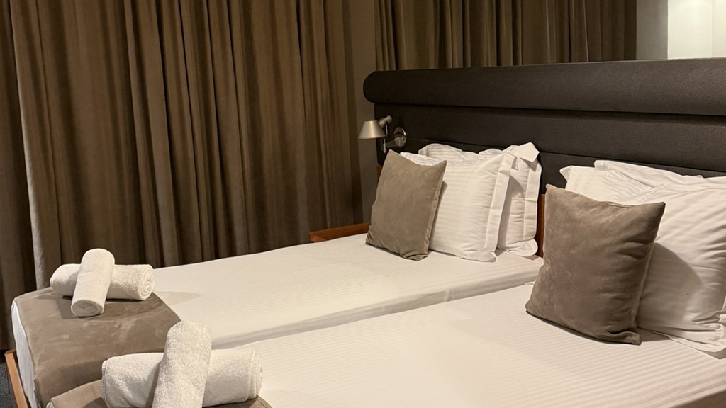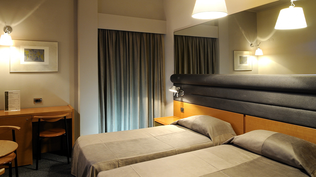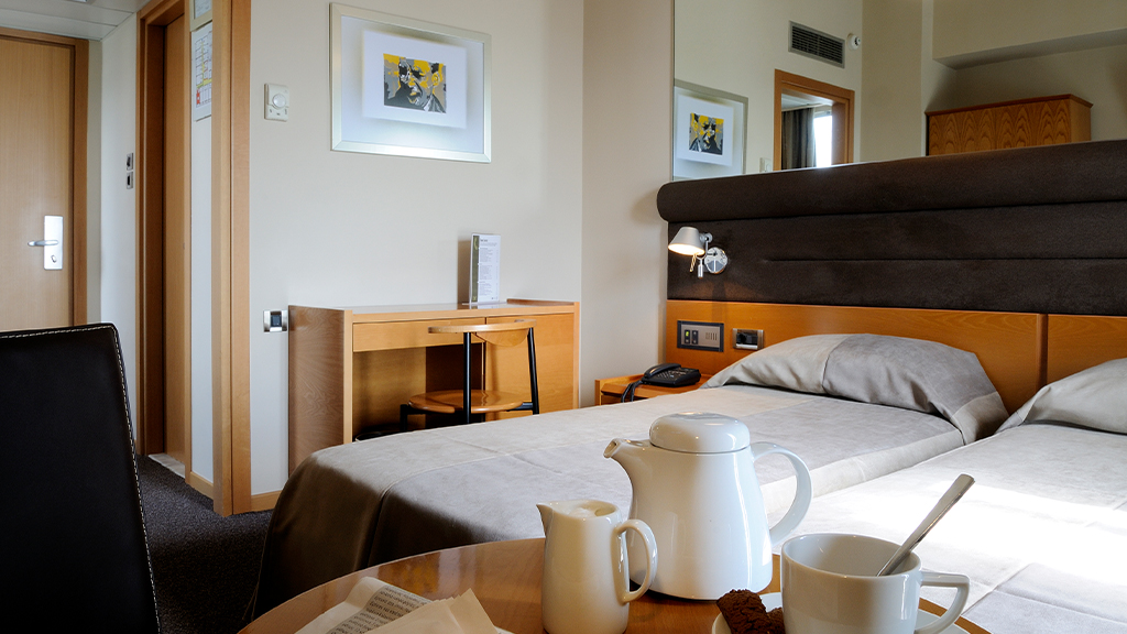Twin room with balcony with city view. It is warmly decorated with contemporary light wood furnishings and soft colors. It features a 28″ LED LCS satellite Phillips TV MPEG-4 and carpeted floors. Includes air conditioning, hairdryer, fridge and Wi-Fi. An iron can be provided upon request.