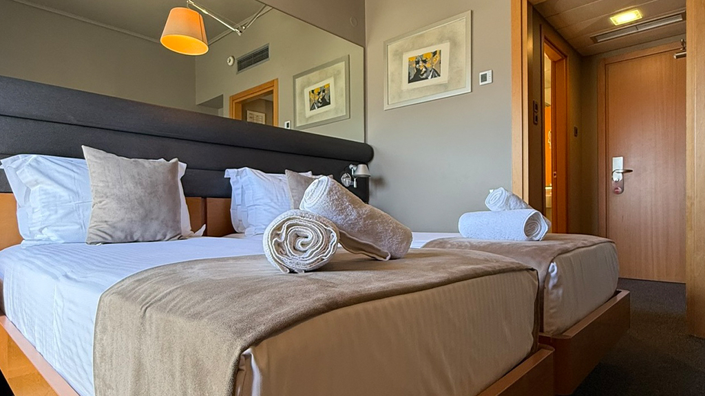 The stylish rooms are warmly decorated with contemporary light-wood furnishings and soft soothing colors. Each room is equipped with air conditioning, 28’ LED LCS satellite Phillips TV MPEG-4, fridge, hairdryer and wall-to-wall carpeting. All rooms have balconies with a city view.